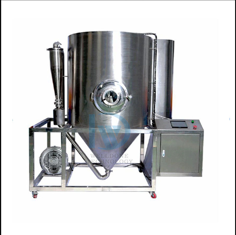 L'air chaud entre dans le séchoir sous forme spirale sous la fonction de distributeur d'air après avoir été filtré et chauffé.la matière première liquide sera pulvérisée dans les perles de brume extrêmement finesGrâce au très court temps de contact avec l'air chaud, le liquide peut être séché en poudre solide finale.Les produits finis seront déchargés en continu du fond de la tour de séchage et du séparateur cycloniqueLes déchets de l'air de la queue seront rejetés par le ventilateur d'échappement.